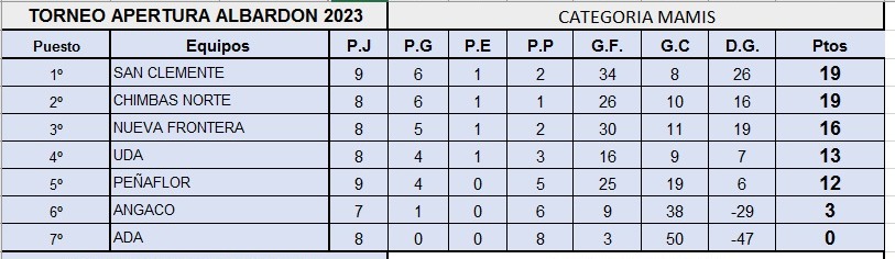 La categoría mamis también está muy entretenida en la tierra del moscatel. San Clemente, uno de los equipos que viene a jugar el torneo master de la ASHSCyP, es líder junto a Chimbas Norte. Este fin de semana la chicas de lila no tuvieron buenas. El primer partido lo perdieron ante UDA por 3 a 0 y el segundo cayeron ante Peñaflor por dos goles abajo. Mientras que las chicas de Chimbas Norte se impusieron a Peñaflor por 3 a 2. El otro que resultado que hubo el pasado fin de semana: Nueva Frontera le ganó 5 a 3 a Angaco. Las que descansaron este fin de semana fueron la chicas de ADA. Así está la tabla de mamis: