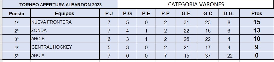 En la categoría caballeros son cinco equipos que pugnan  por quedarse con el trofeo del torneo apertura. El líder, Nueva Frontera no tuvo buena joranda ya que perdió ante Central Hockey por 6 a 4. Mientras que Zonda ganó 4 a 2 ante Albardón HC . No fue tan malo para los chicos AHC por que se impusieron ante Central Hockey por 4 a 2. Así quedó la tabla: