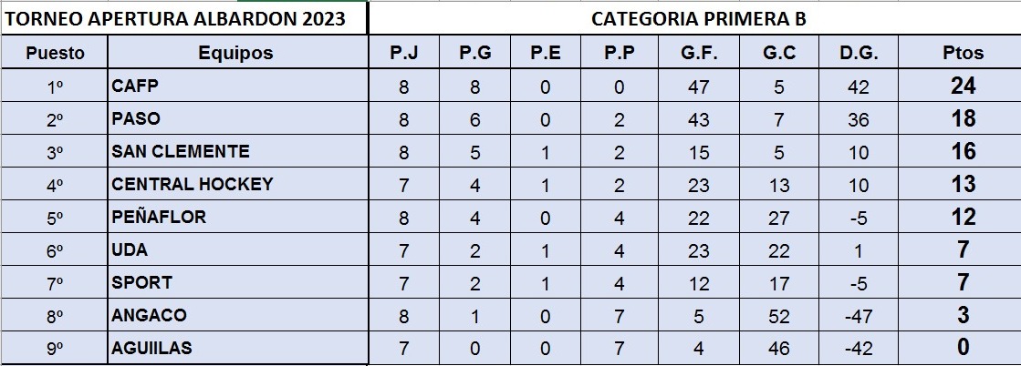 Las chcias de la segunda categoría del hockey albardonero tuvieron sus partidos este fin de semana por la decima fecha. El líder CAFP ganó 3 a 0 ante Central Hockey. Mientras que Sport le ganó a Angaco por 3 a 0. En el otro partido, Peñaflor dio cuenta de Sport por 3 a 2. Asi quedó la tabla de posiciones.